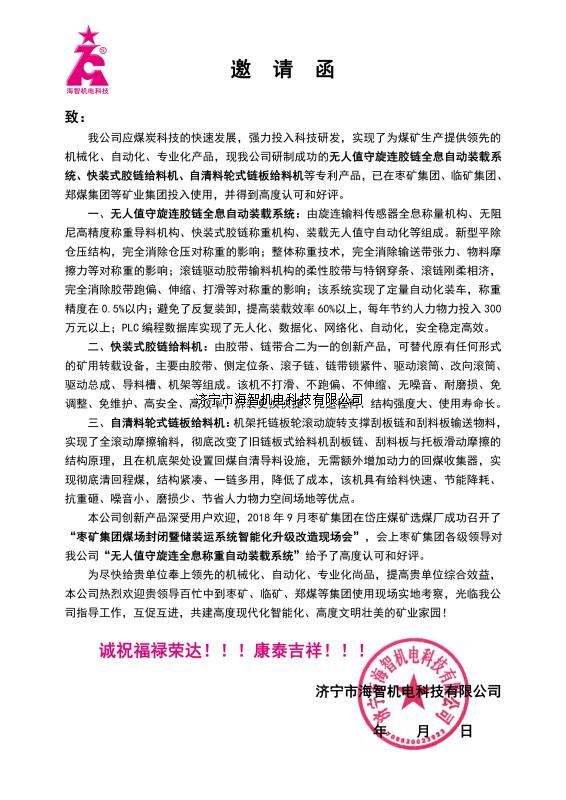 本產(chǎn)品一經(jīng)推出即獲得各大設(shè)計(jì)院及用戶的一致好評(píng),率先在棗礦集團(tuán)岱莊煤礦取得成功應(yīng)用,2018年9月受邀參加了《棗礦集團(tuán)煤場(chǎng)封閉暨儲(chǔ)裝運(yùn)系統(tǒng)智能化升級(jí)改造現(xiàn)場(chǎng)會(huì)》,智能裝車系統(tǒng)得到了充分肯定!我司憑借雄厚的加工制造實(shí)力及過(guò)硬的創(chuàng)新技術(shù)能力,勢(shì)必為運(yùn)輸稱重系統(tǒng)、快速計(jì)量裝車系統(tǒng)帶來(lái)又一次的技術(shù)創(chuàng)新變革。